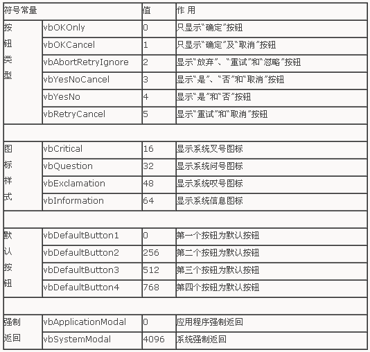 2、Buttons-------可选的参数,指定显示按钮的数目及形式,使用的图标样式,缺省按钮是什么以及消息框的强制回应等。如果省略,则 buttons 的缺省值为 0。