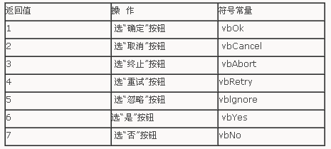 MsgBox函数返回值是一个整数,可以是1~7之间的任意整数,它们分别对应7个按钮被选中的状态。