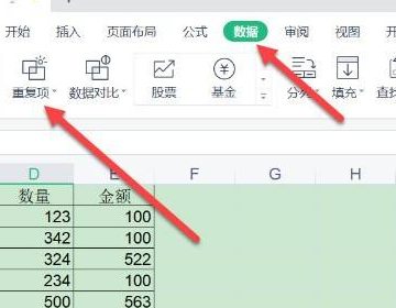 1、首先在电脑中打开表格,在数据选项下点击重复项。
