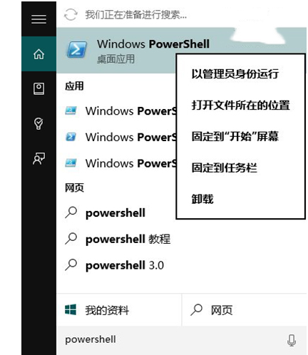 1、点击任务栏的搜索(Cortana小娜)图标,输入Powershell,在搜索结果中右键单击Powershell,选择“以管理员身份运行”。