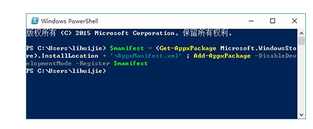 $manifest = (Get-AppxPackage Microsoft.WindowsStore).InstallLocation + ‘\AppxManifest.xml’ ; Add-AppxPackage -DisableDevelopmentMode -Register $manifest