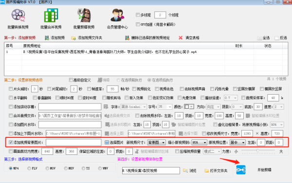 可以添加的,一般都是用工具来操作,首先准备一个自己平时用比较顺手的工具 ,视频用剪辑高手,视频和图片也 要备好。 1,运行它 2,点批量剪辑这个功能 3,把视频添加进去 4,勾选添加视频背景图片 5,把图片 导入进去再设置新视频的尺寸 6.点开始剪辑怎么同时剪辑多段视频,加背景图,音乐?