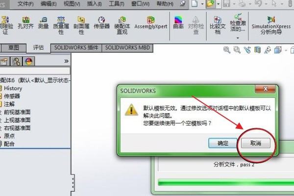 4.此时,系统会弹出分析文件对话框,提示:“默认模板无效……”要继续使用空模板吗?,请务必点击“取消”按钮,如下图所示。