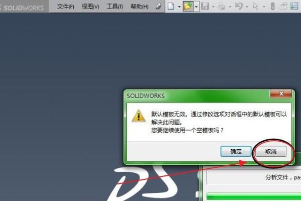 6.在弹出的Solidworks界面中,一旦“默认模板无效……要继续使用空模板吗?此时继续点击cancel选项进入下一页,如下图所示。