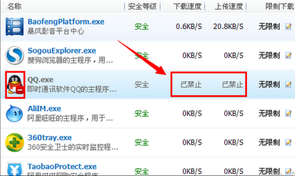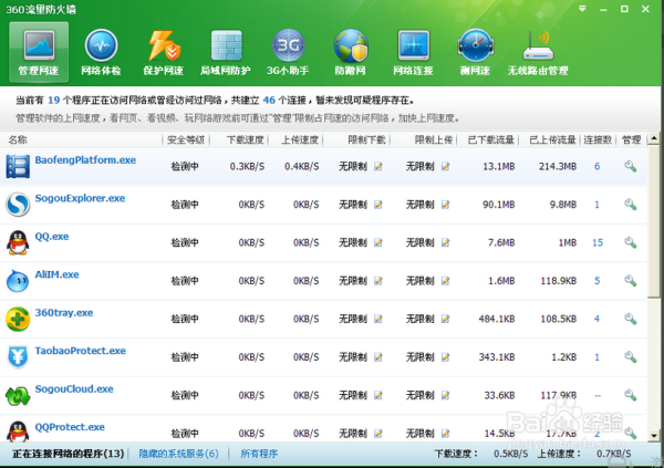 3.打开后可以看到正在联网的程序,以及流量的消耗情况