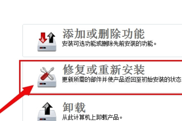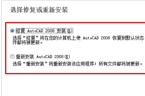 4、在CAD的弹出框里选择“修复或重新安装”。