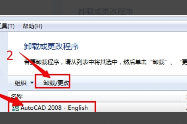 3、在“名称”下面找到AutoCAD,并点击,然后在点上面的“卸载/更改”。