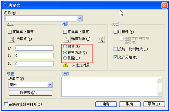 在CAD中,无论是采用BLOCK命令创建块还是用WBLOCK命令写块文件,关于对象都有三种处理方式:保留、转换为块、删除(从图形中删除)。