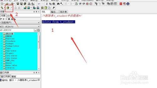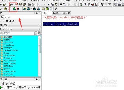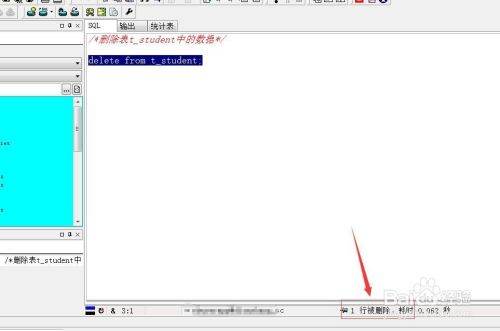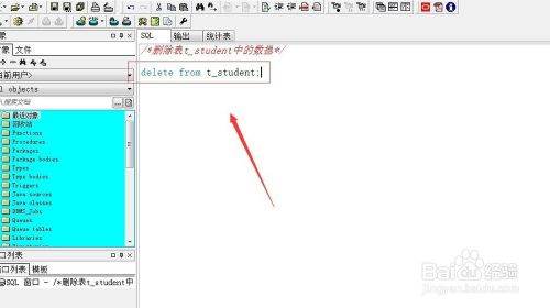 接下来,我们以删除“t_student”表中的内容为例,编写SQL语句,“delete from t_student;”,如下图所示