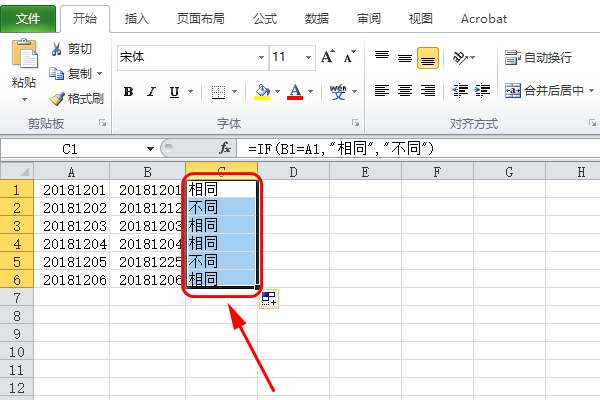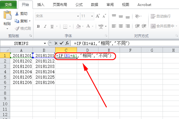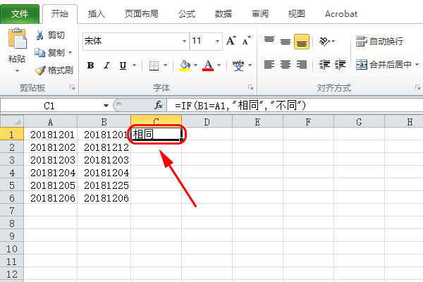 2、选中C1单元格,然后输入公式“=IF(B1=A1,"相同","不同")”;