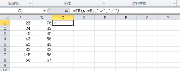 2、在C列设置公式=if(A1=B1,"√","×"),点击回车,对第一行的判断结果就返回在C列;