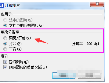 3.设置压缩图片分辨率,有三个选项。网页/屏幕类型是最低的分辨率,默认是打印200dipi。
