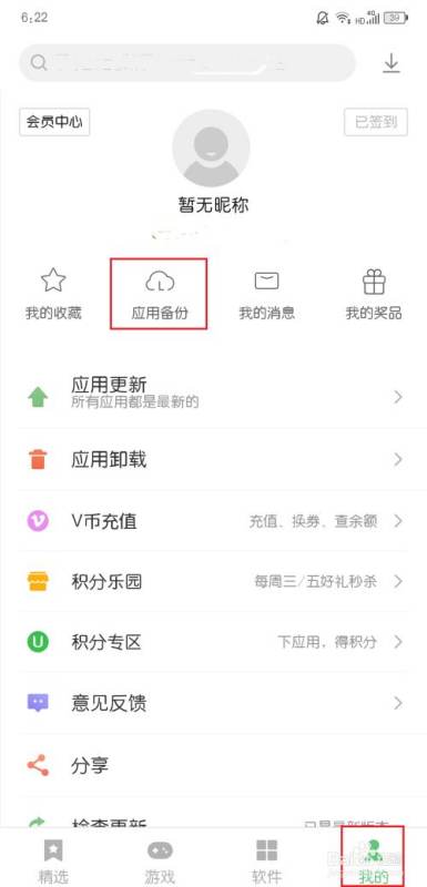 进入个人中心后我们会看到”应用备份“的图标,点击这个图标进入。一般系统出厂时所携带的软件系统会自动进行备份,我们可以在里面直接找到,如果是我们自己下载安装的软件要提前通过这个功能进行备份然后才能恢复。另外出厂所带软件一般在重新恢复出厂设置后会自动进行安装。