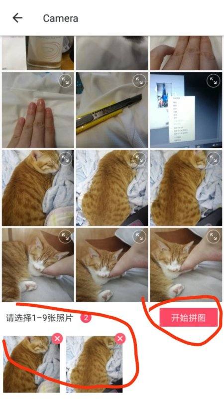 3、选择你想放在一起的两张图片,它会自动运行到底部框,然后点击“开始拼图”。