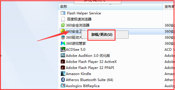 2、然后我们在弹出来的窗口中找到360安全卫士,右键单击该应用选择“卸载/更改”,之后点击“卸载”。