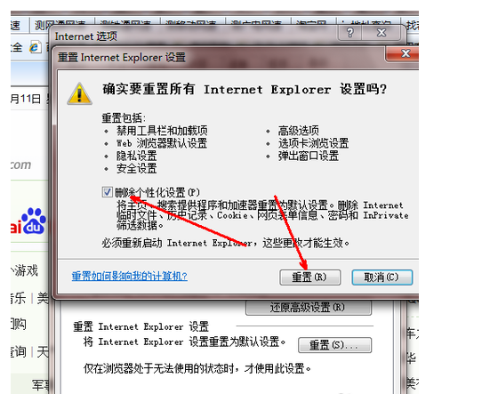 5、删除所有的个人设置以及自定义的浏览器设置。包括个人资料,缓存,cookies等。选定前面的复选框,点击确定开始重置。重置后需要重启浏览器。