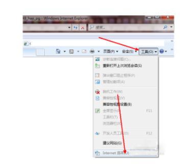3、打开IE浏览器,在菜单栏中,点击工具菜单,然后点击最下面的internet选项。如图所示。
