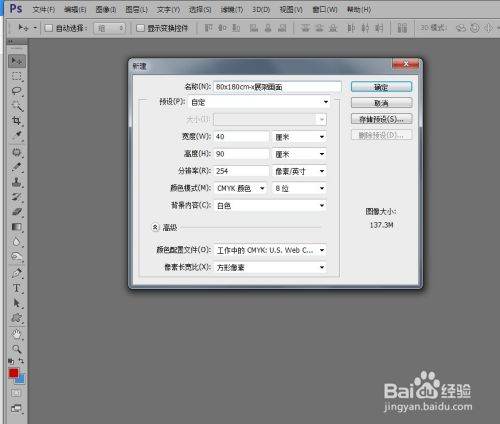 以设计一个80x180cm的展架画面为例:我们可以新建一个画布大小为40x90cm、分辨率为254dpi的文件进行设计制作。具体设置数值为:尺寸40x90厘米,分辨率为:254像素/ 英寸,色彩模式为:cmyk,8位。