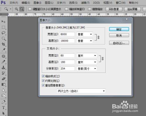 将保存后的jpg文件重新再ps里打开,在菜单栏中,点击“编辑-图像大小”直接更改尺寸及分辨率即可(这里必须勾选“约束比例”)。一图为我们缩小版设计尺寸,二图为放大后的客户要求成品尺寸。