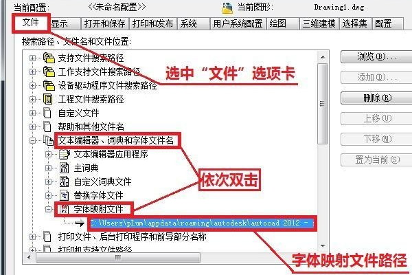 2、在“选项”对话框中单击“文件”选项卡(软件默认打开的是“配置”选项卡),在此选项可以看到字体映射文件“acad.fmp”完整的保存存路径及文件名,见下图。