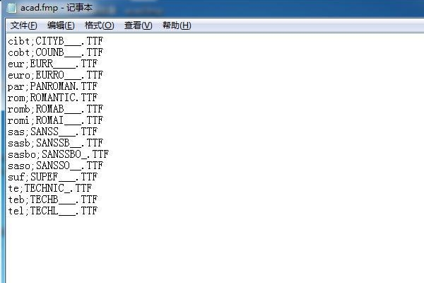 3、根据路径找到“acad.fmp”文件,并用Windows系统的自带的文本编辑器“记事本”打开该文件。