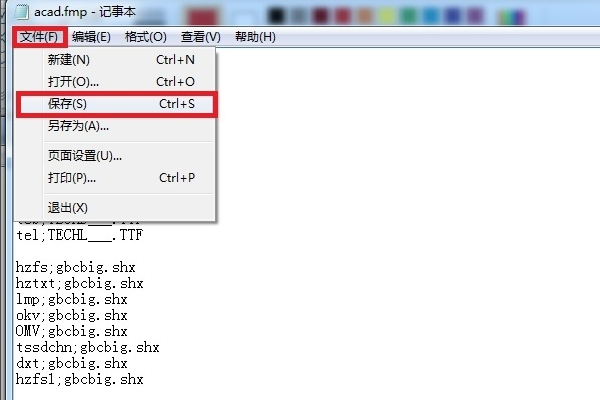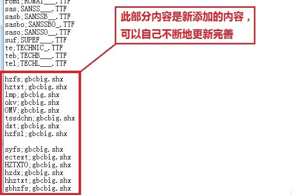 4、在打开的“acad.fmp”文件中,将你缺少的字体映射为“gbcbig.shx”字体。例如缺少“hzfs”字体,就在文件中添加内容“hzfs;gbcbig.shx”。缺少的字体和“gbcbig.shx”之间用英文的分号“;”隔开。