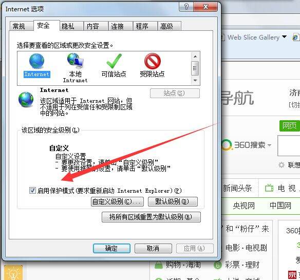 3.把“启用保护模式”的勾选去掉,另外,切换到“高级”选项卡,找到“增强保护模式”,如果前面有勾选并可选的话,请您将前面的勾去掉;