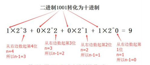 1001转十进制:1*2^0+0*2^1+0*2^2+1*2^3=9。