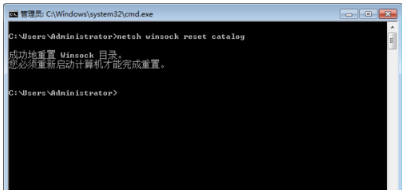 3、 在命令窗口继续输入:netsh winsock reset catalog 注:重置Winsock 目录。