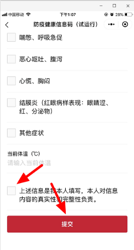 6、填好当天的健康信息,包括当前体温,然后勾选本人填写,点击“提交”即可成功打卡,如下图所示: