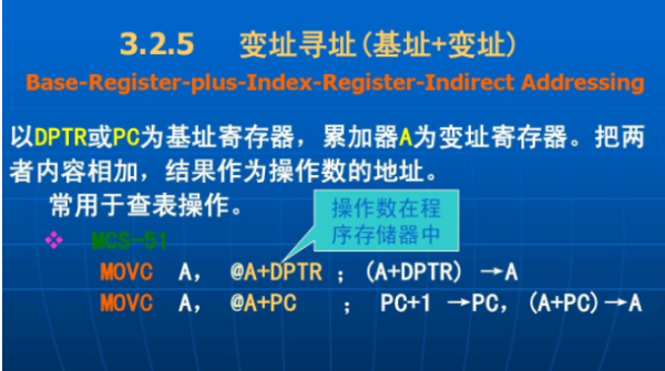 movc a,@a+pc是用十六位程序计数器pc加累加器中地址内容得到的结果传送给a。 movc a,@a+dptr是用数据指针作为基址寄存器。两者都可以用来间接寻址。MOVC A, @A+DPTR 是什么意思?
