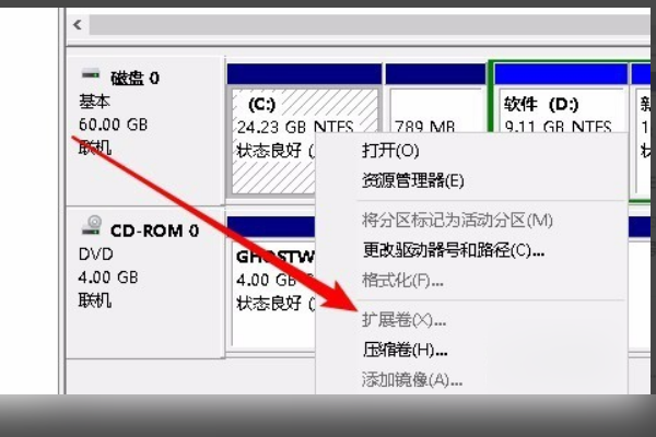 3,最后,选中要扩展的磁盘,点击右键,点击“扩展卷”即可,问题解决。