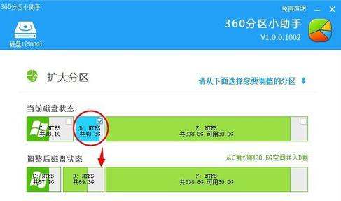 5、在将滑块条向右拖动的同时,您也将看到C盘的大小在增大,D盘大小在减少。