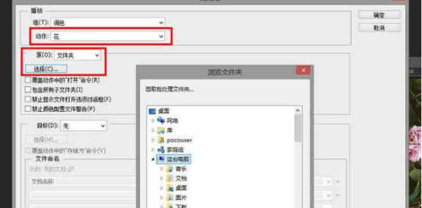 9、弹出对话框,“动作”选择你需要的那个动作。“源”的文件夹指的是等待批量编辑的那组原图的文件夹。全部选好后,点“确定”,一组图片就自动按照所做的步骤去调整了。