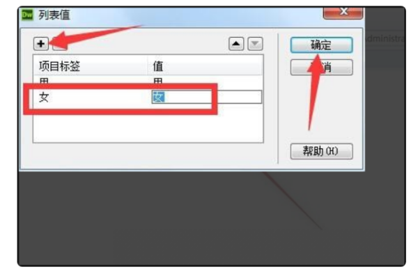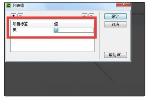 8、跳出列表值界面,并填写项目标签上的下拉菜单选项。例如,我想在这里制作一个性别选择下拉菜单。在这里,填写男性值和项目标签。