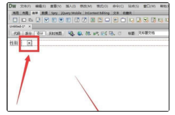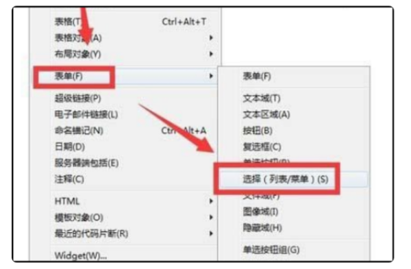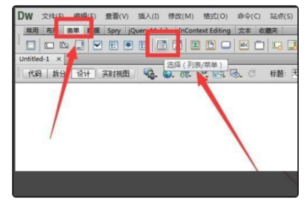 3、创建新网页后,单击“设计”页上的“插入-表单-选择(列表/菜单)”以插入可选择的下拉表单。