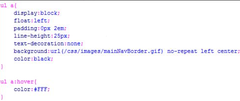 4.最后美化一下,给a标签左右2em的间距,同时加上竖线背景(mainNavBorder.jpg),并弄上:hover时的变化(这里只是让颜色变化) 在上面的CSS基础上,添加如下代码: