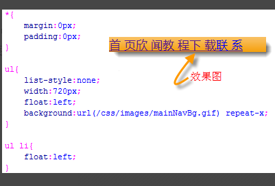 3.然后开始CSS部分。首先:加背景;其次:将竖直列表变成水平,用float:left就可以实现。相应的CSS代码如下(附效果图):