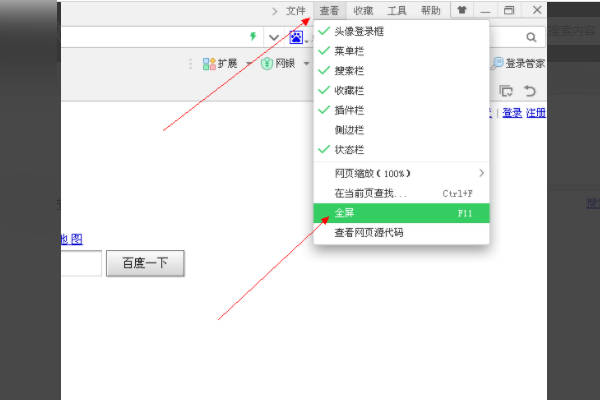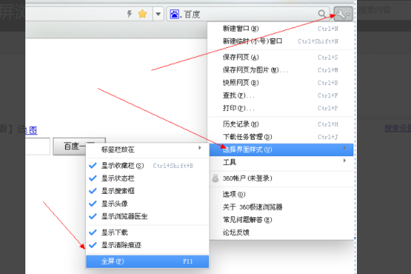 4、然后点击全屏选项,360极速浏览器全屏默快捷键认是F11,直接按F11也可直接进入全屏。