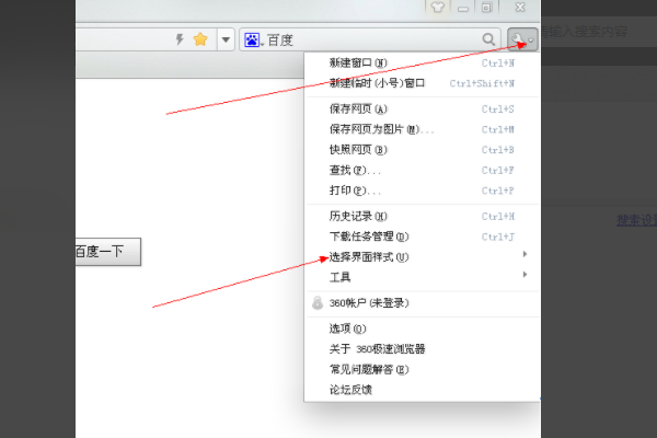 3、如果我们使用的是360极速浏览器那么我们点击网页右上方设置图标,点击【选择界面样式】选项。