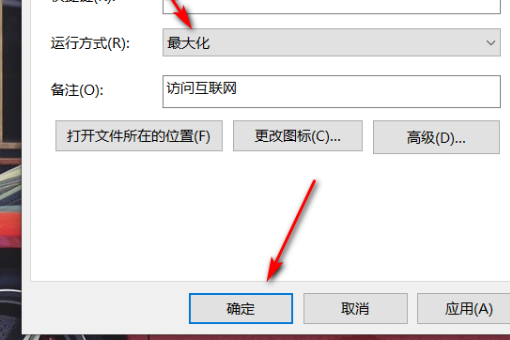 3、进入“360浏览器属性”对话框后,选择并单击“操作模式”下的“最大化”,设置完成后单击“确定”。