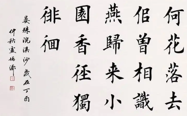 首先,落款签名,应该按照作品形式如中堂,条幅,斗方,对联,手卷,尺页,扇面等等,结合内容,字数,书体,预先进行通盘考虑,然后再决定落款的位置和布局。这就是说,书法作品的最后如何落款,应该先从章法构图的大局上去进行斟酌,然后才能找准恰当位置,以便能与整件作品的布局,获相得益彰的妙绪。