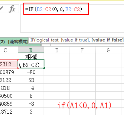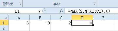 同样,如果要求上述计算结果表示为非负数,即当结果为负数时表示为0,可以用:=MAX(SUM(A1:C1),0),比用IF函数的公式简洁。