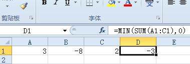 比如在D1中显示A1:C1的和,若结果为负值,保留计算结果,否则结果为0,如果用IF函数,公式为:=IF(SUM(A1:C1)<0,SUM(A1:C1),0),但此时可以用最小值函数MIN设计公式:=MIN(SUM(A1:C1),0);