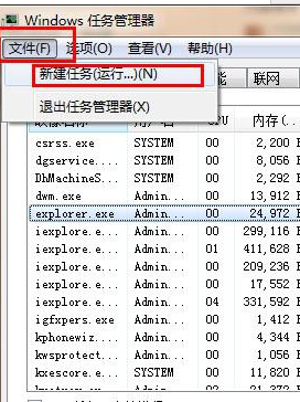2、选中“explorer”进程单击右键选择结束进程,在windows任务管理器中找到“文件”,选择文件下面的“新建任务”;