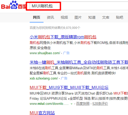1、百度搜索“MIUI刷机包”。