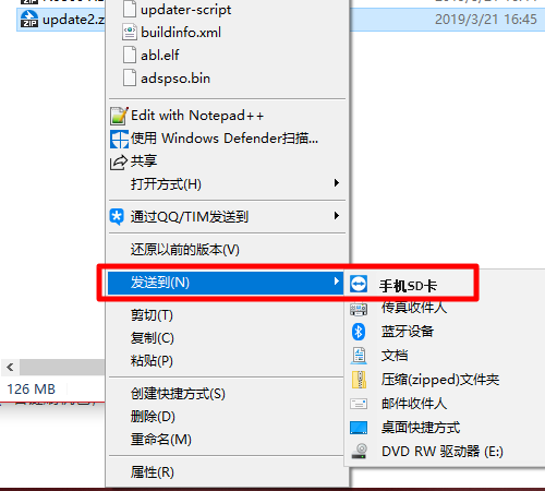 5、右键刷机包,选择“发送到手机SD卡”。