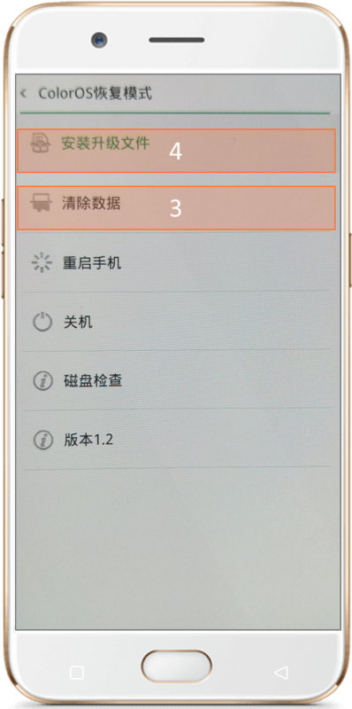 2、将手机关机,关机状态下,同时按住电源键和音量下键,等手机震动一下后松开,进入OPPO恢复模式。
