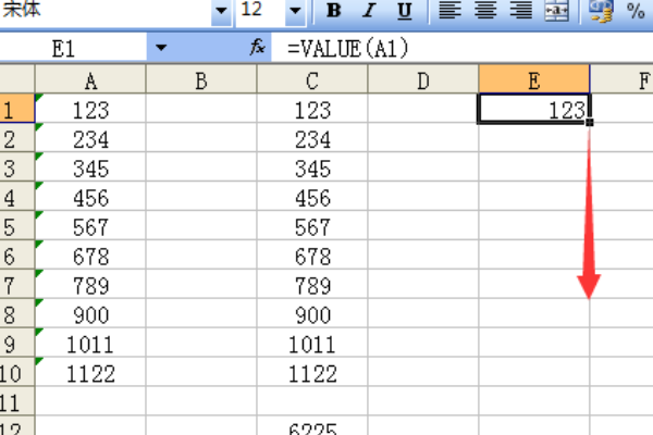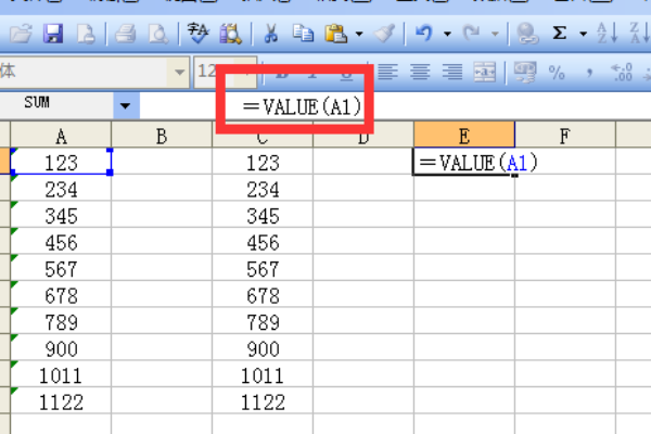 4、您可以在单元格中键入= VALUE(A1)。此函数的功能是将文本类型转换为数字类型。
