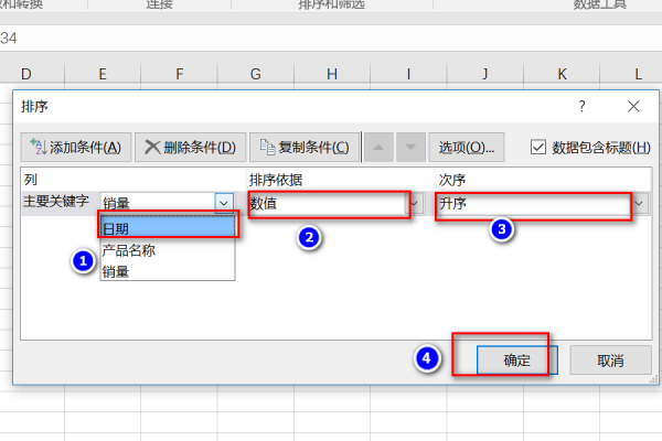 3、在弹出的对话框中,以此选择“日期”、“数值”、“升序”,点击“确定”。
